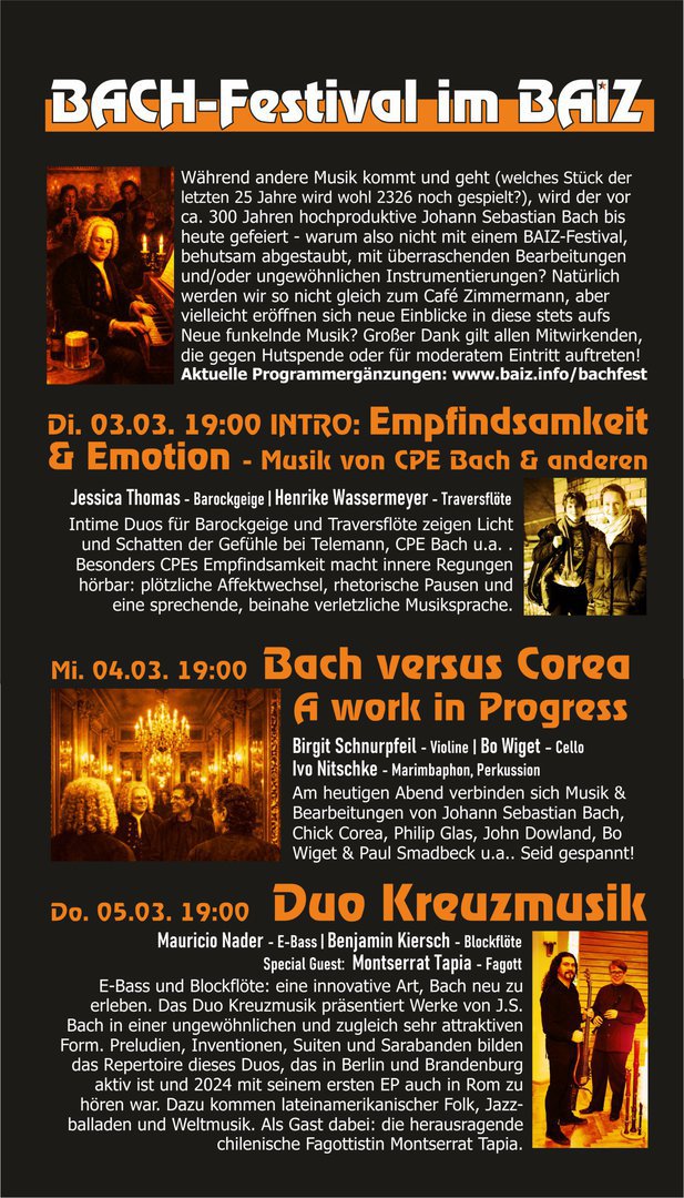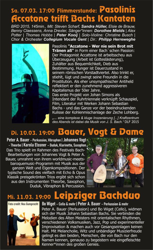 Peter A. Bauer (Perkussion) und Bo Wiget (Cello), widmen sich der Musik Johann Sebastian Bachs. Sie verbinden die Melodien des Alten Meisters mit orientalischen Rhythmen, verschiedenen Volksmusiken, Jazz, Pop und experimenteller Improvisation und machen auch vor Gesangseinlagen keinen Halt. Mit Melancholie, Witz und unbändiger Musizierfreude gelingt es den beiden, Menschen, die von Bach nur den Namen kennen, genauso zu begeistern wie eingefleischte Kenner*innen des